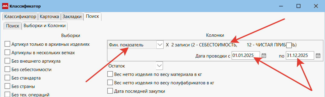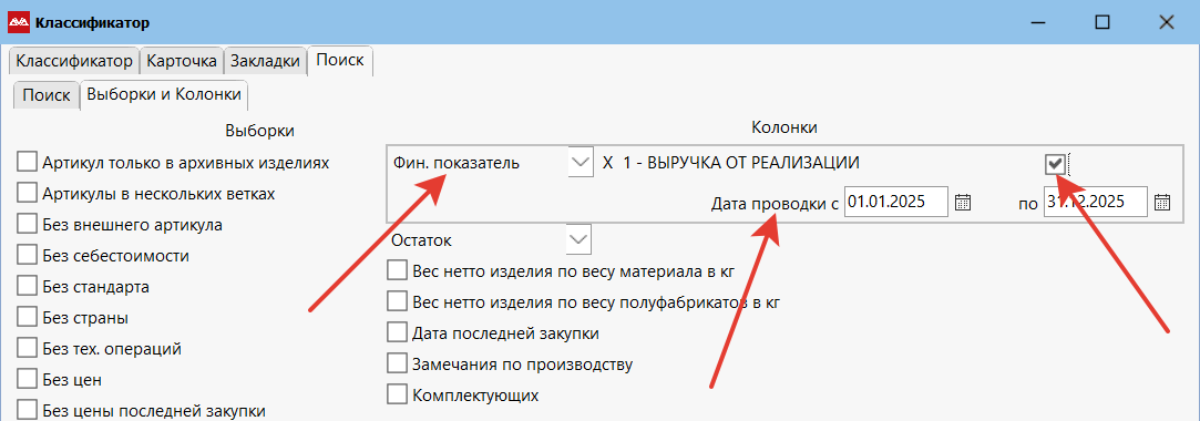 Зайдите в классификатор Главное меню → Классификатор. Запустите «Поиск», перейдите на вкладку «Выборки и Колонки». Нажмите кнопку «Фин. показатель», выберите финансовый отчет и показатель(и) из этого отчёта. Укажите период.