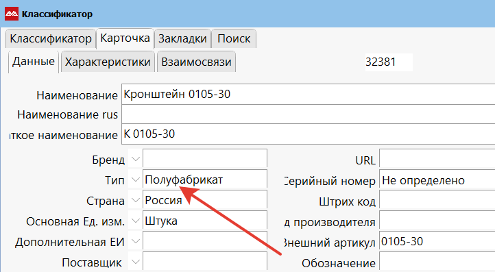 При занесении номенклатуры (SKU) в Классификатор, на его карточке нужно выбрать соответствующий тип: «Изделие» (если это конечное изделие), «Полуфабрикат» (для полуфабрикатов, узлов), «Полуфабрикат на стороне» (для того, что изготавливается по кооперации), «Деталь», «Сборочная единица», «Заготовка».