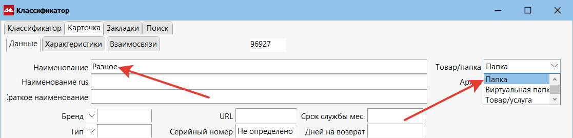 Для занесения новой папки нажмите новая запись, откроется карточка новой записи. В выпадающем списке «Товар/папка» (в правой части карточки) выберите значение «Папка», в поле «Наименование» укажите название папки.