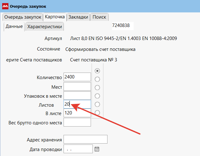 При занесении счета поставщика из очереди закупок вы сразу сможете указать ровное количество листов, как показано ниже.