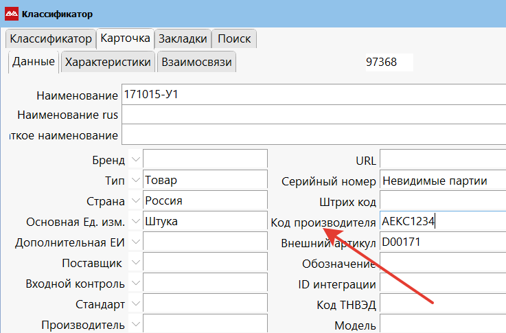 Если ваша компания является российским производителем, то ваш Код производителя (Part Number) будет выглядеть, как сочетание букв и цифр. Скорее всего это будут 4 буквы и какие-то цифры. Свой Код производителя (Part Number) вы тоже записываете в это поле для своих изделий.