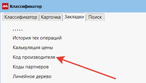 Для занесения остальных, находясь на товарной позиции в классификаторе, перейдите в «Закладки» и выберите пункт «Код производителя».