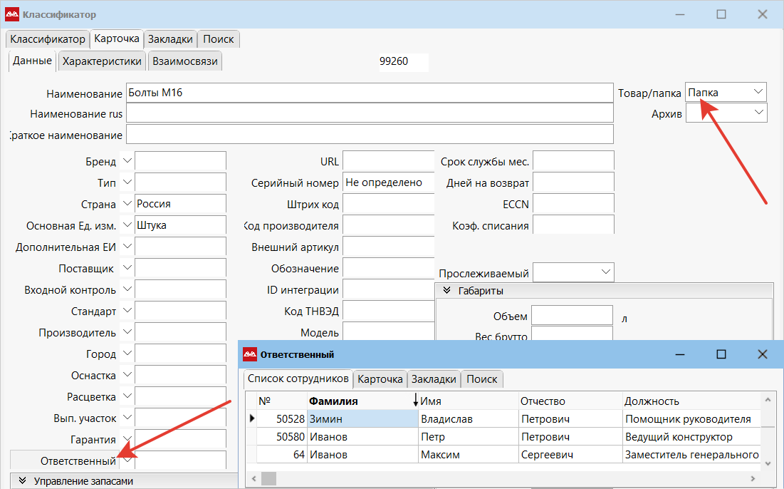 В классификаторе при необходимости можно «закрепить» ответственного за каким-либо товаром или целой папкой.