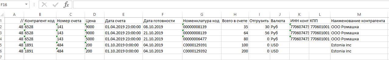 Дата выполнения (колонка F). Дата готовности, когда товар по счету должен быть готов к отгрузке (если это известно).