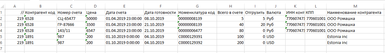Аналогичное расположение колонок в файле должно быть и для счетов поставщиков.