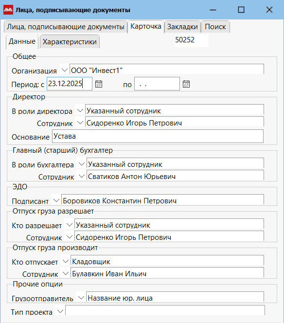 В роли директора. Кто от лица директора будет подписывать документы. Про характеристики, которые открываются по этой кнопке, можно прочитать здесь.
