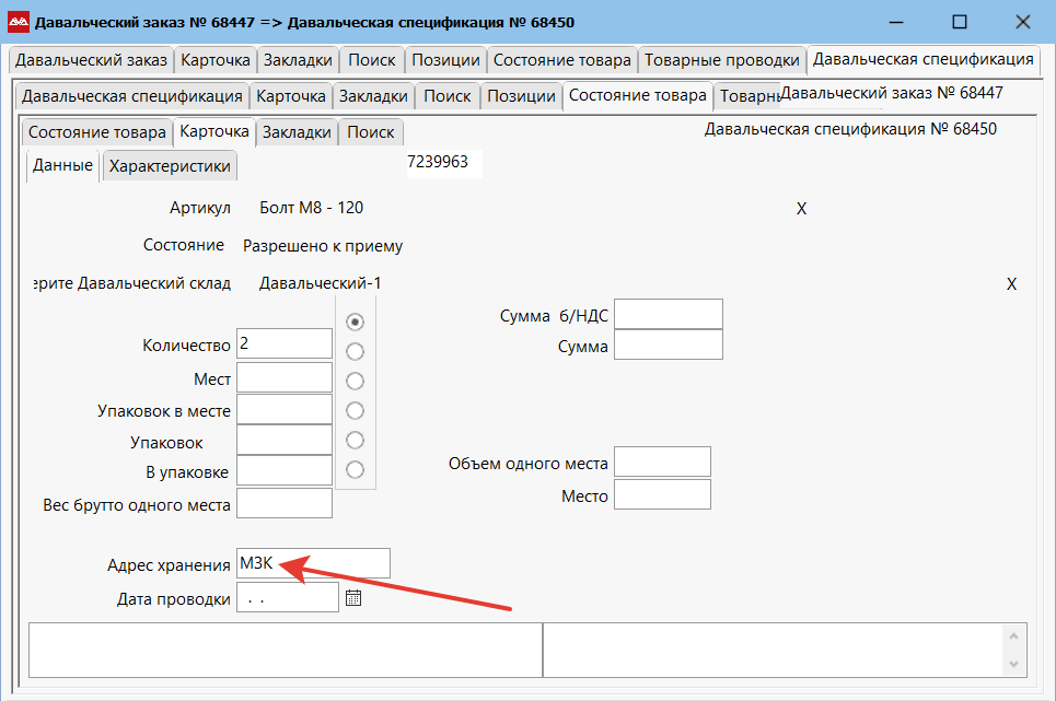Автоматически подставится адрес хранения. В названии адреса будет указан клиент. То есть система на давальческом складе под этого клиента выделит полку.