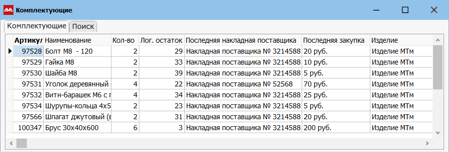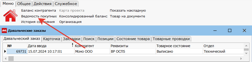 Теперь мы должны занести материалы/комплектующие, которые привез клиент. Чтобы посмотреть весь список материалов/комплектующих для всех изделий в этом давальческом заказе, перейдите Меню → Ведомость покупных.