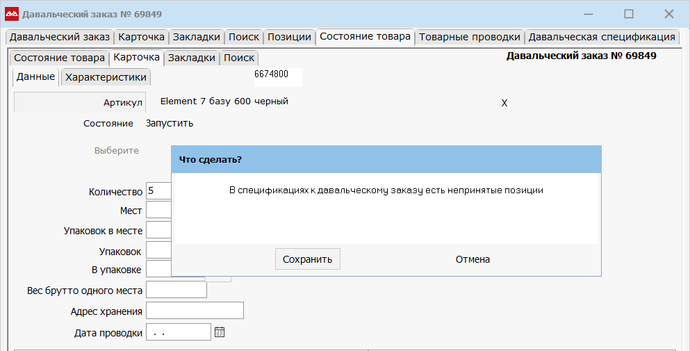 Если хоть одна позиция спецификации не будет принята на склад, то система в давальческом заказе при запуске изделия в работу выдаст сообщение «В спецификациях к давальческому заказу есть непринятые позиции».