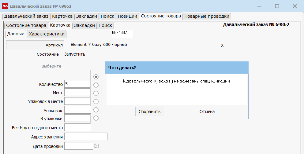 Если клиент привез комплектующие/материалы сразу на несколько давальческих заказов, то занесите спецификацию к любому из них. Примите комплектующие/материалы по спецификации на склад. К следующим давальческим заказам спецификации заносить ненужно. При запуске в давальческом заказе (к которому не занесена спецификация) изделия в работу система выдаст сообщение «К давальческому заказу не занесены спецификации».