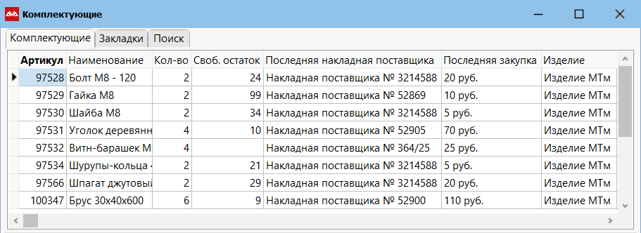 Теперь мы должны занести материалы/комплектующие, которые привез клиент. Чтобы посмотреть весь список материалов/комплектующих для всех изделий в этом давальческом заказе, перейдите Меню → Ведомость покупных.