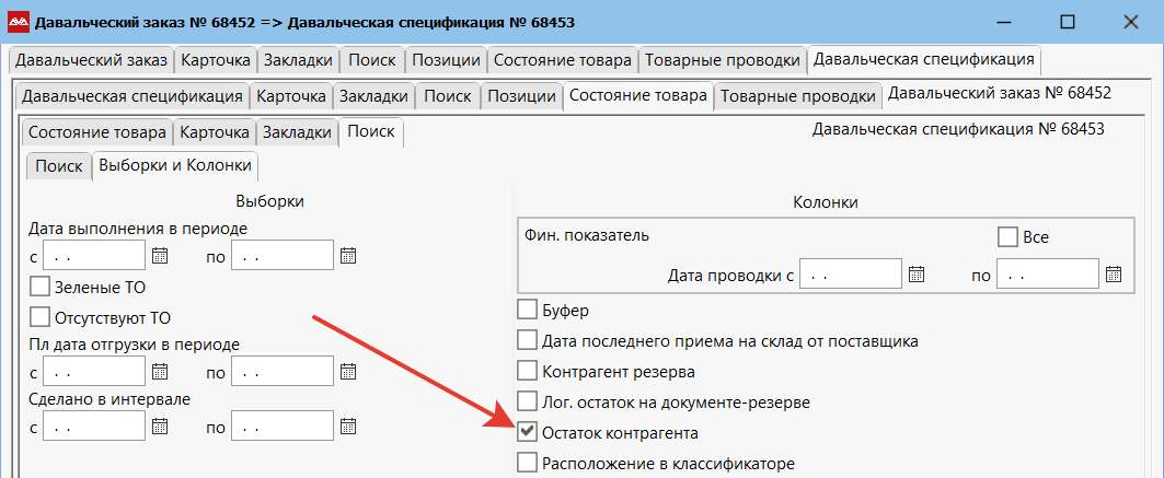 Нажимаем F6 («Состояние товара»), запускаем Поиск, в «Выборках и Колонках» ставим галочку «Остаток контрагента».