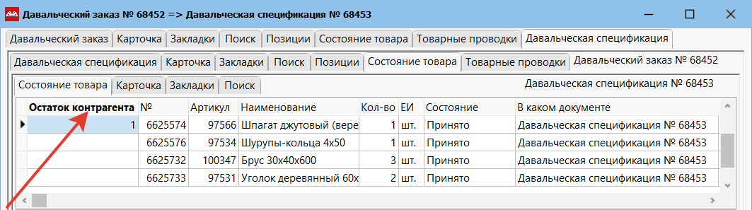 Программа по каждой позиции покажет остаток этого элемента, который принадлежит именно этому контрагенту. То есть тот складской остаток, который остался от того, что привез этот клиент.