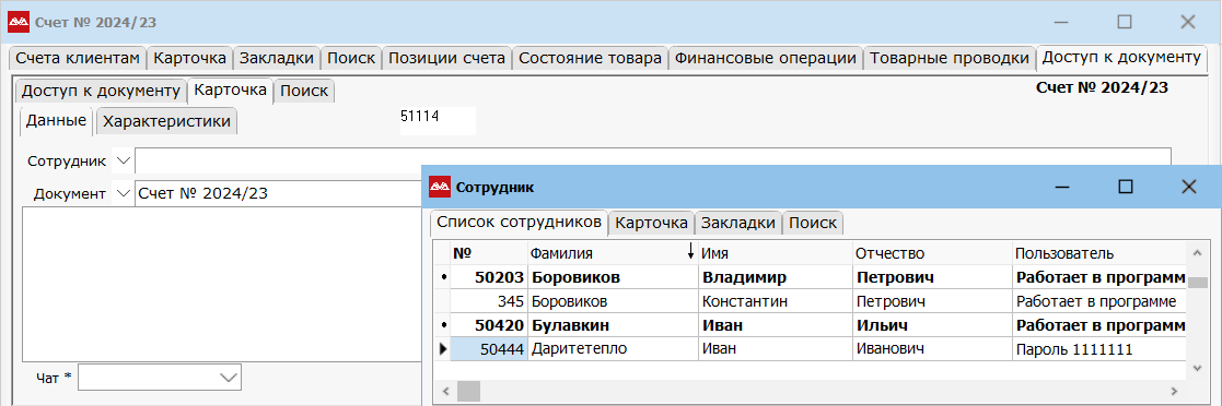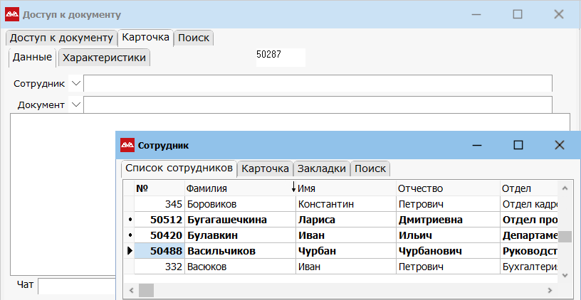 Чтобы добавить вручную сотрудников в чат по документу позиционируйтесь на нужном документе, перейдите в «Закладки» и выберите пункт «Доступ к документу». Нажмите новая запись. Покажется список сотрудников, отметьте пробелом нужных и выберите. Сохраните запись.