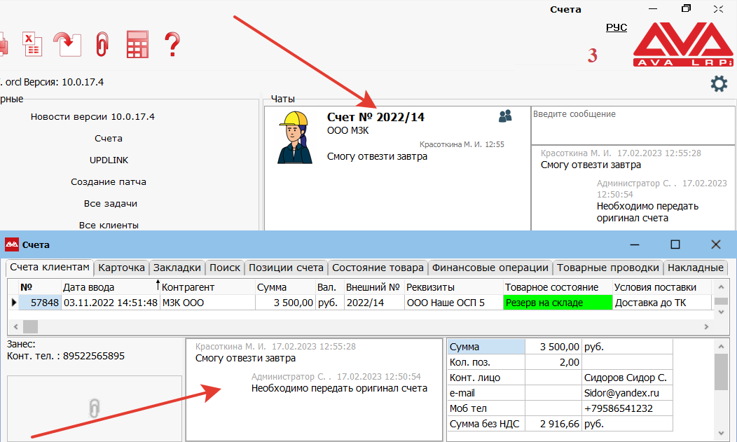Кроме того можно вести переписку в виде чата по какому-либо документу, например, по счету клиента.