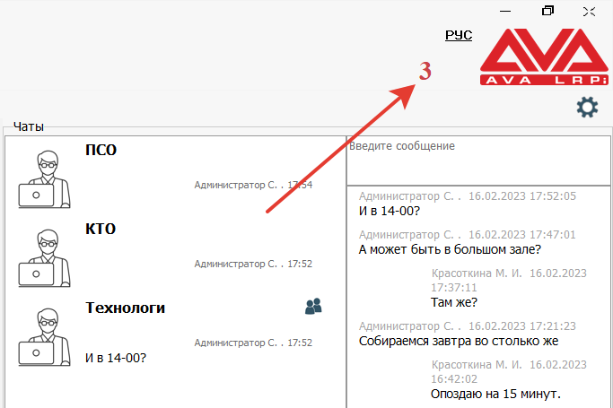 В программе реализована возможность переписки сотрудников в чатах.