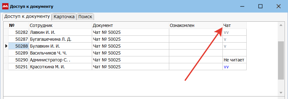 Чтобы добавить сотрудников в чат, нажмите на иконку, как показано на картинке внизу. Или с карточки чата перейдите в «Закладки» и выберите пункт «Доступ к документу».