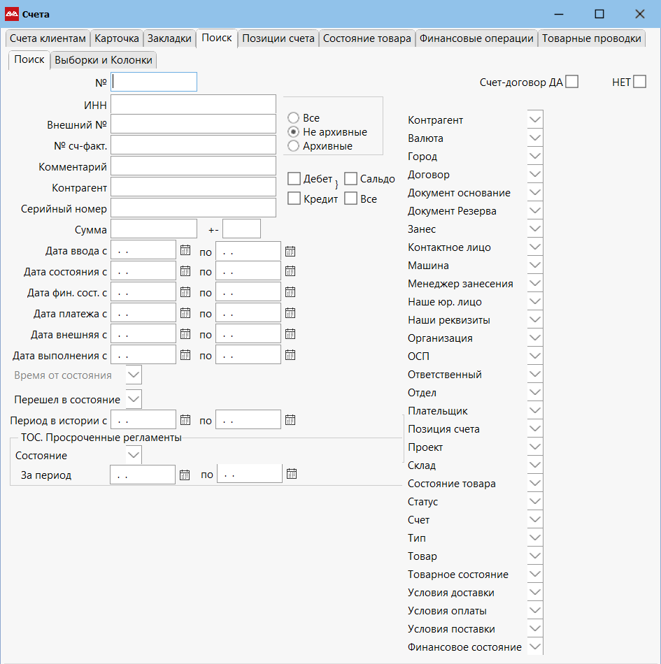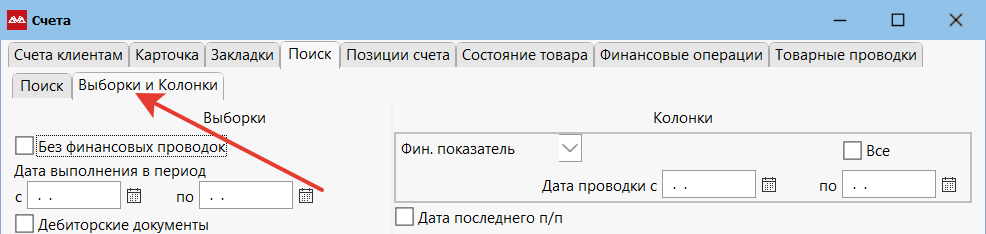 Дополнительные возможности для поиска и показа дополнительных колонок находятся в «Выборках и Колонках».