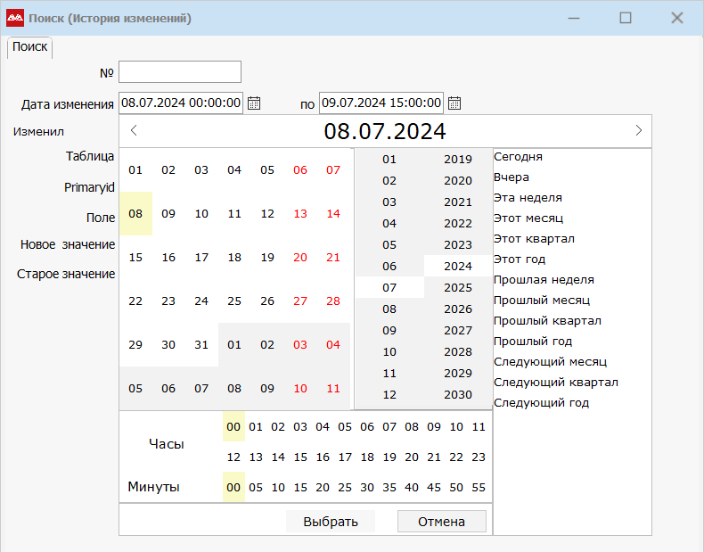 В открывшейся форме можно задать поиск по датам и времени изменений, которые внес пользователь.