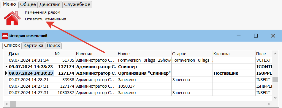 Если вас заинтересовала одна из записей в истории изменений, и нужно посмотреть какие еще изменения внес в систему пользователь, указанный в записи в этот день, то, находясь на интересующей записи, нажмите Меню → Изменения рядом.