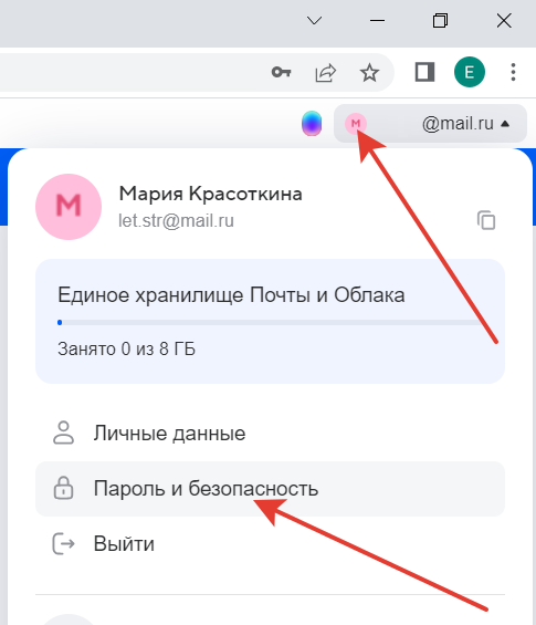 Войдите в Mail почту. В правом верхнем углу экрана нажмите на «Иконку аккаунта», затем нажмите «Пароль и безопасность».