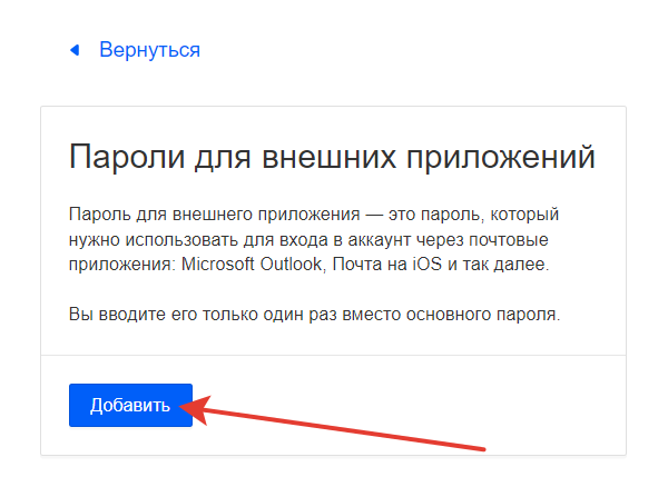 В разделе «Безопасность» в «Способах входа» перейдите в «Пароли для внешних приложений».