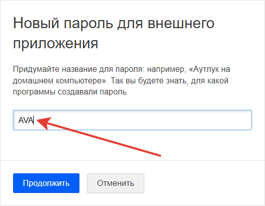 В появившемся окне введите название пароля, любое произвольное наименование, например, AVA. И нажмите «Продолжить».