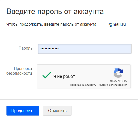 В открывшемся окне «Введите пароль от аккаунта», подтвердите что «вы не робот» и нажмите «Продолжить».
