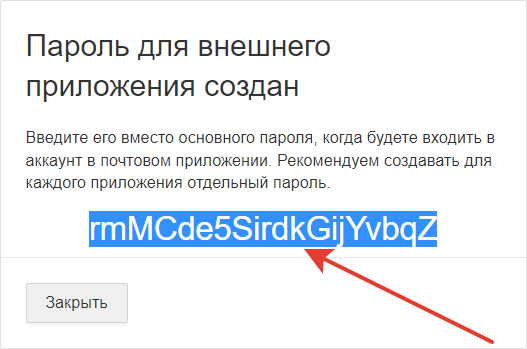 Вернитесь в Mail почту, нажмите «Закрыть» в окне «Пароль для внешнего приложения создан».