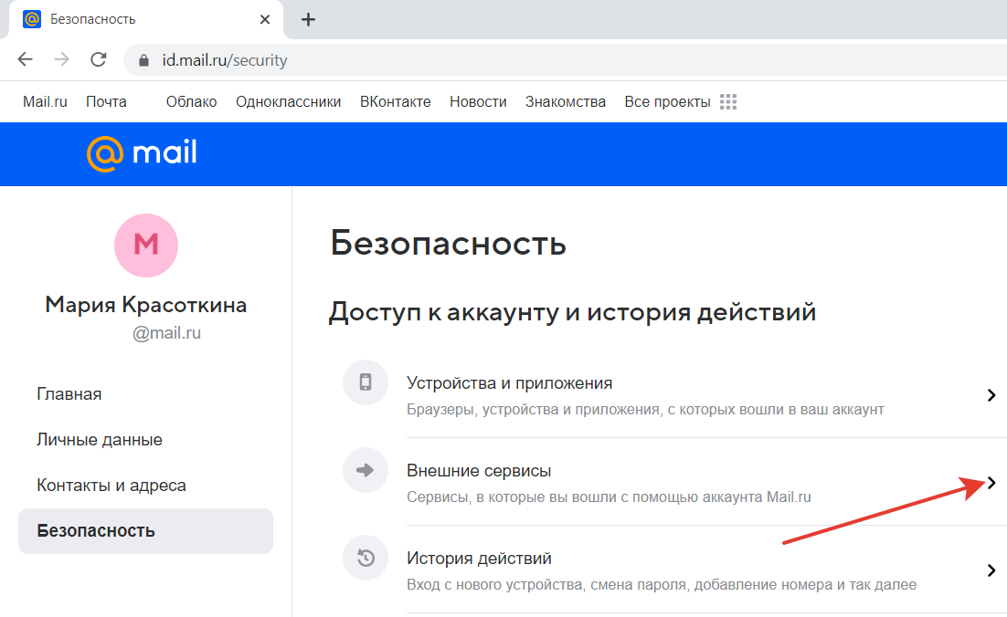 В разделе «Безопасность» в «Доступ к аккаунту и история действий» перейдите в «Внешние сервисы».