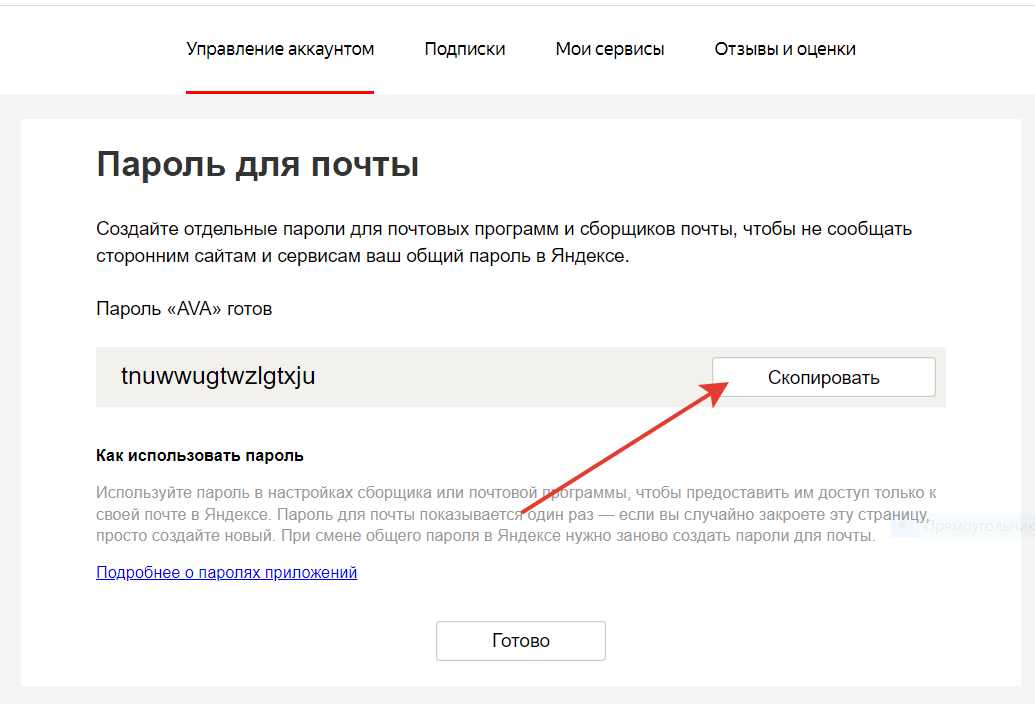 Нажмите кнопку «Создать», откроется окно с новым паролем. Нажмите «Скопировать», этот пароль скопируется в буфер обмена.