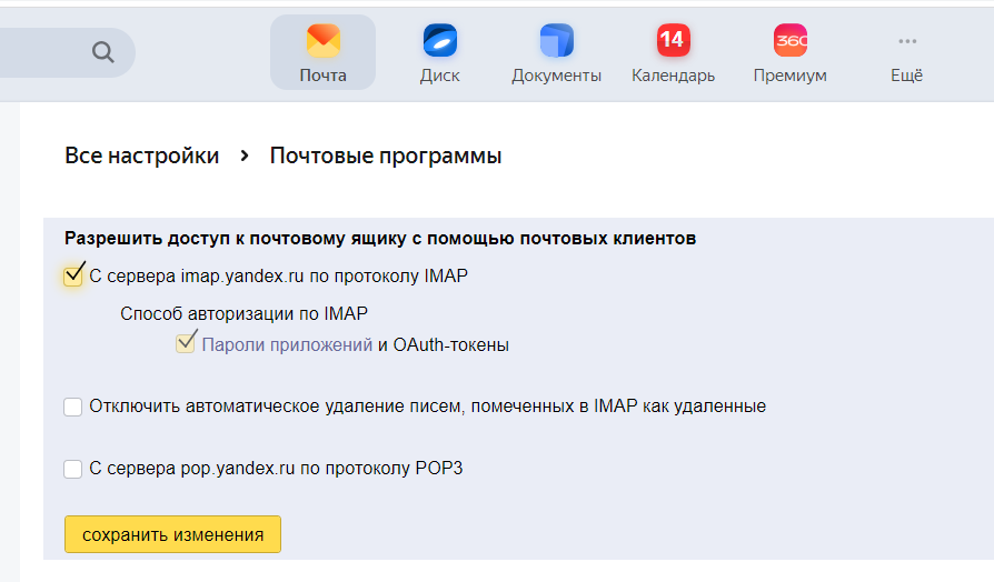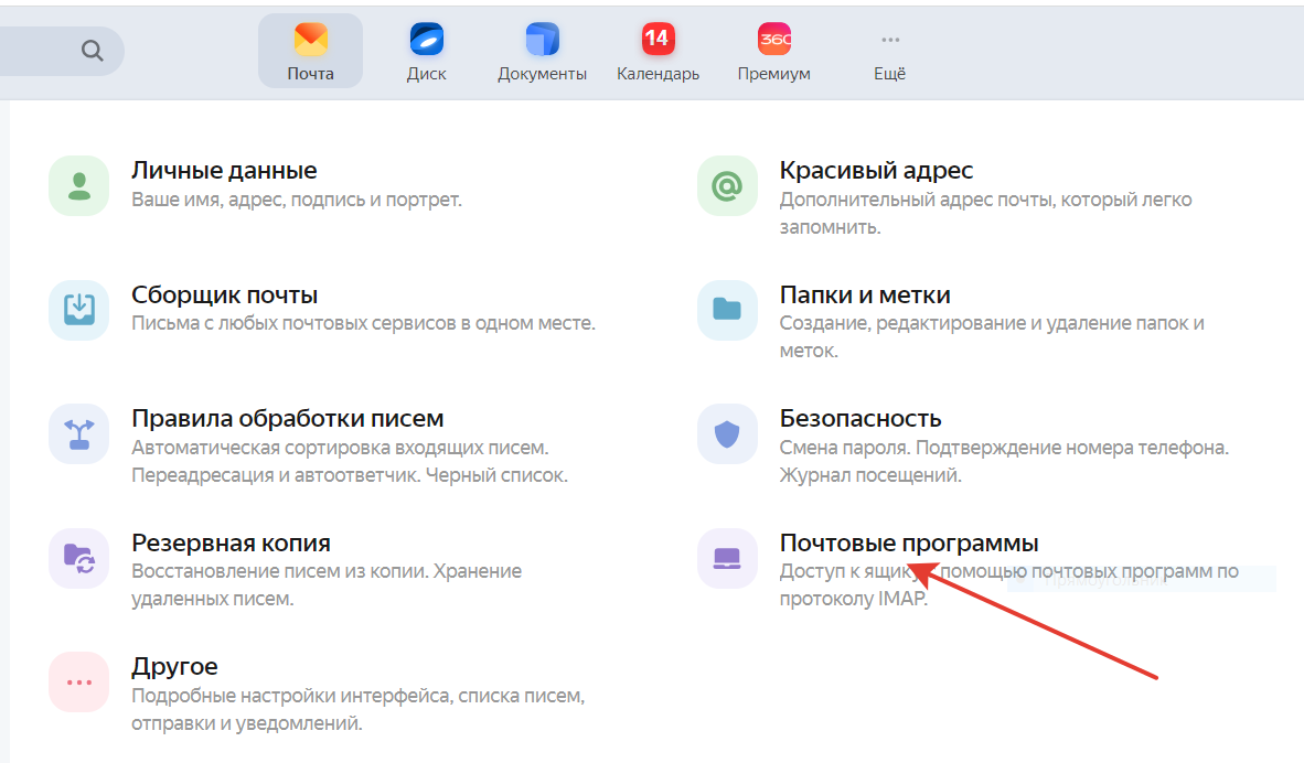 Вернитесь в Яндекс, нажмите «Готово» в окне «Пароль для почты». Перейдите в Настройки (Шестеренка → Все настройки), выберите раздел «Почтовые программы».