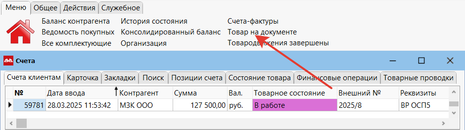 Находясь на документе, например счете, запускаем пункт Меню → Товар на документе.