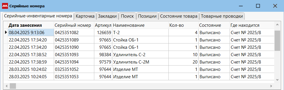 Система покажет все товарные позиции, отгруженные по этому документу в разрезе партий-серийных номеров.