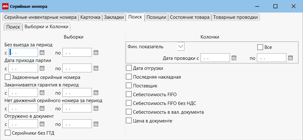 Для этого непосредственно в списке Серийных номеров, запустите поиск, затем на вкладке «Выборки и колонки» проставьте соответствующие «галочки» и запустите поиск. Система отразит соответствующую информацию в списке.