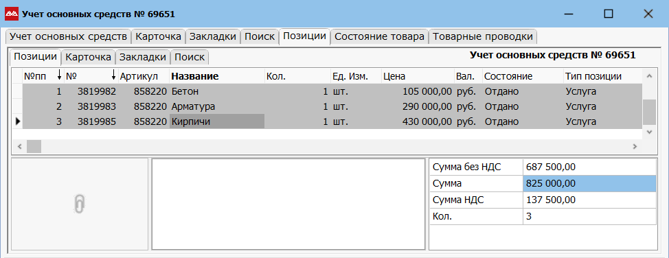 Затем перейдите в «Позиции» ЗДСа, встаньте на позицию «Услуга служебная», нажмите корректировать запись (F2) и в поле «Название» укажите конкретно на что пойдут затраты, например, «Кирпичи». Сохраните запись.