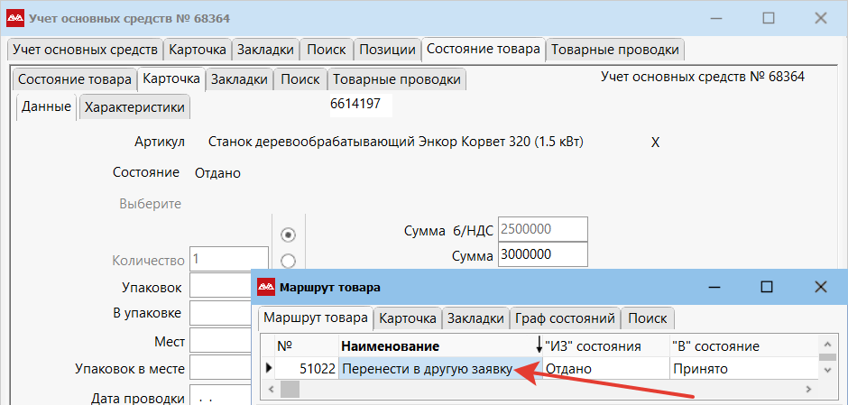 Встаем на нашу заявку, переходим в закладку «Состояние товара». И выполняем движение «Перенести в другую заявку».