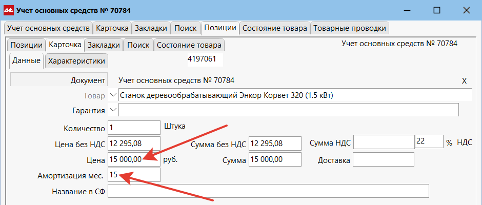 Наше основное средство теперь в новой заявке. Открываем ее и указываем цену и срок амортизации в месяцах, который остался.