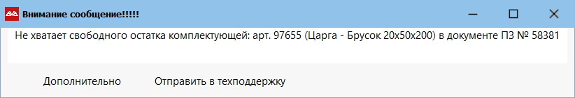 Например, если программа не нашла комплектующие в достаточном количестве на цеховом складе или в перемещении в цех (если оно уже сформировано), на экран будет выведено сообщение «Не хватает свободного остатка комплектующей: арт. (номер) (наименование) в документе ПЗ № (номер)».