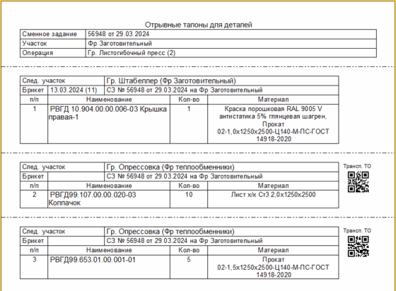 Для закрытия операции откройте очередь Техопераций участка и отсканируйте QR код рядом с названием детали. Куар код на отрывном талоне — это для транспортировки вашей детали. Его нужно сканировать после перемещения детали на требуемый участок (тот, который написан в талоне в графе «След участок»).