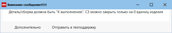 - Деталь/узел/сборка должна быть в состоянии «К выполнению». То есть вся предыдущая «матрешка» должна быть на соответствующем цеховом складе. В противном случае закрыть сменное задание нельзя. Система выведет сообщение «Деталь/сборка должна быть “К выполнению”. СЗ можно закрыть только на 0 единиц изделия».
