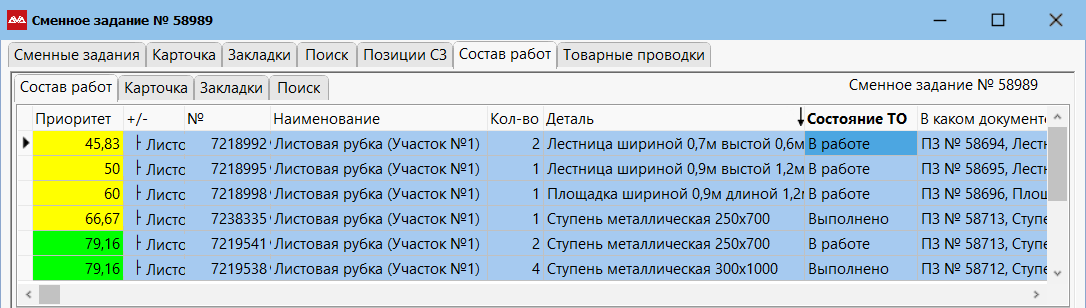 Если в СЗ несколько ОДИНАКОВЫХ деталей по разным производственным заданиям, то в «Составе работ» в колонке «Итого кол.» будет указано общее количество этой детали по СЗ. В этом случае, если вы выполнили только часть деталей, то удобнее использовать движение «Выполнить автоматически». В этом случае программа сама закроет самые приоритетные из них.