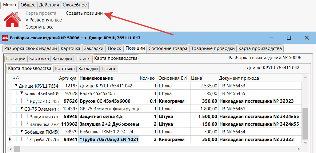 Перейдите в «Позиции» и занесите разбираемое изделие.
