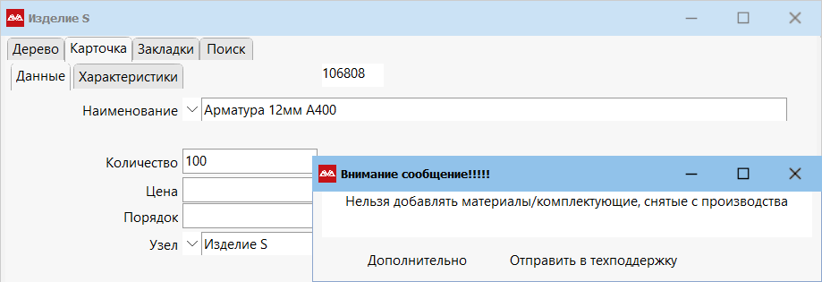 Снятую с производства покупнину (тип товара — материал/комплектующая, товар) нельзя добавить в дерево изделия (система покажет сообщение «Нельзя добавлять материалы/комплектующие, снятые с производства»),