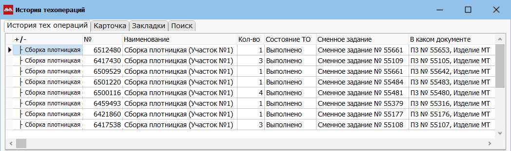 Система выведет на экран список всех выполненных техопераций по этой детали (сборке, изделию, полуфабрикату).