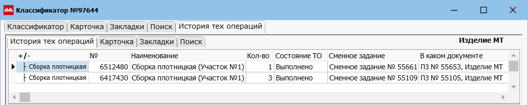 Также историю выполненных техопераций можно посмотреть через классификатор. Позиционируйтесь на нужном артикуле в классификаторе, перейдите в «Закладки», выберите пункт «История тех операций». Система выведет на экран список техопераций по этой детали (сборке, изделию, полуфабрикату).
