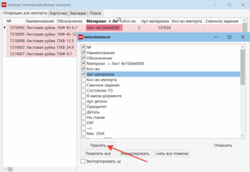 Иногда при импорте раскроя необходимо уточнить не только количество изготовляемых деталей, но и изменить артикул материала. Например, вместо двух листов 4х1500х6000, возможно использовать один лист 4х2000х6000, для уменьшения остатков.