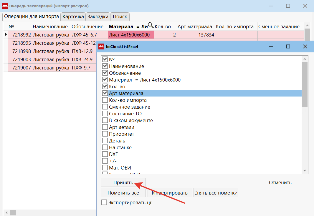 Для изменения артикула материала дополнительно в «Очереди техопераций (импорт раскроя)» перед экспортом в Excel, добавьте колонку «Артикул материала».