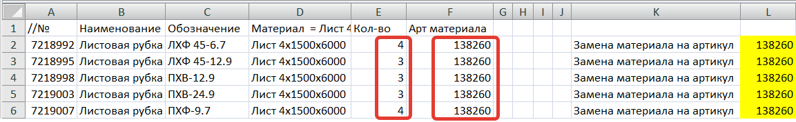 Если импорт прошел успешно, в файле .xls в колонке «К» будет указано «Замена материала на артикул», ячейка в колонке «L» будет окрашена в желтый цвет и указан новый артикул материала.