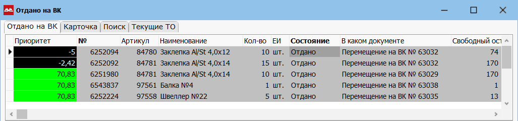 В очереди ВК есть приоритет и количество, которое сейчас важно. Приоритет показывается минимальный из статуса позиции под заказ клиента и статуса «Дней на возврат» — какой статус меньше, тот и показывается. Приоритет будет «зеленым», когда позиция придет на склад, и «черным», когда истечет время проверки.